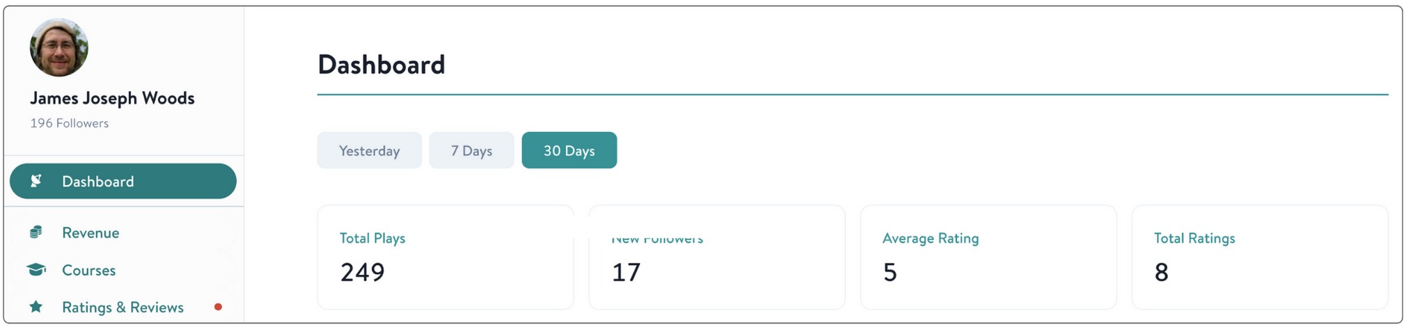 - Average Rating — your average rating score across all of your published content, reflecting community satisfaction with your teaching