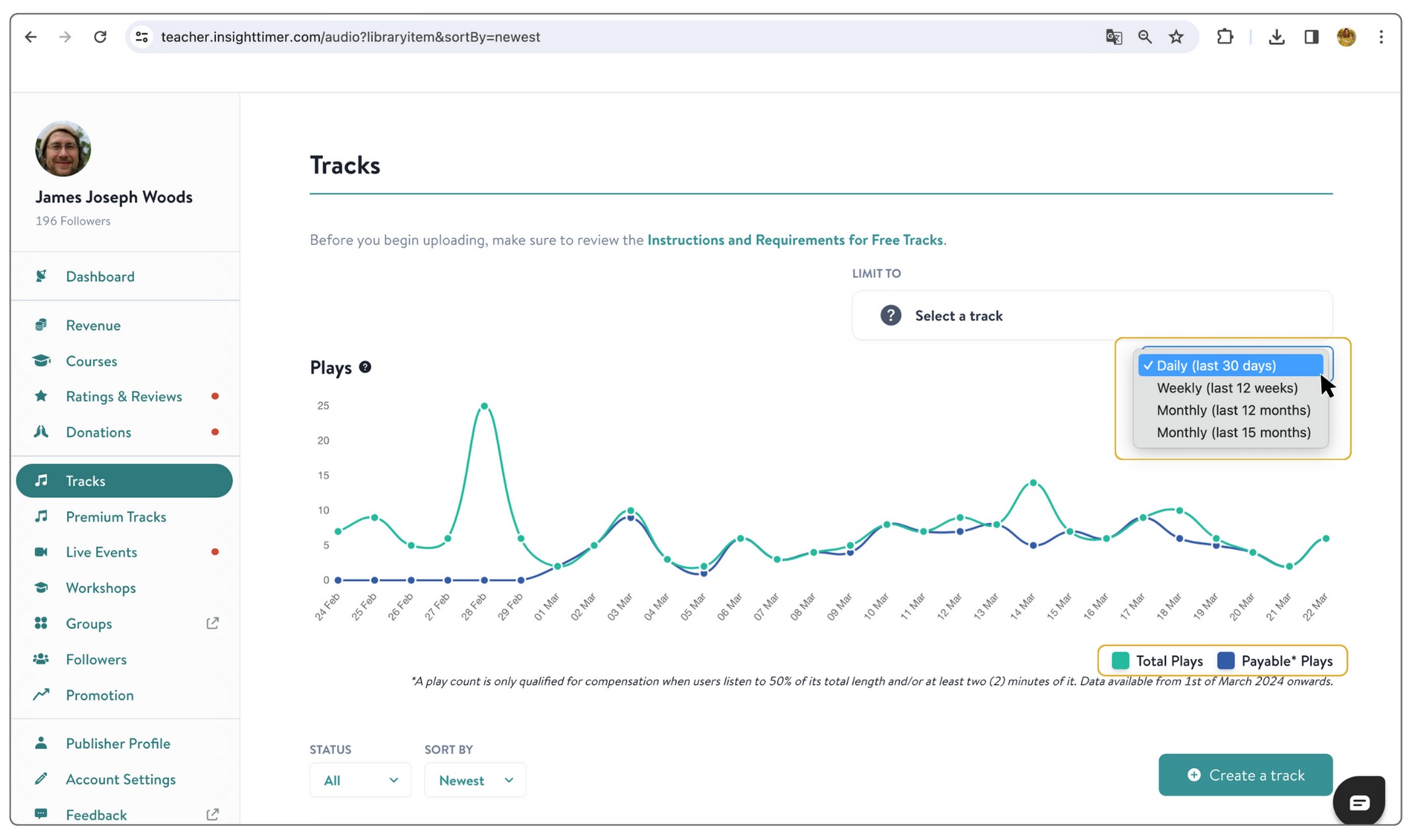 You can view both the total number of plays and the number of payable plays for your tracks. Understanding these two distinct metrics is essential for teachers seeking payment and tracking community engagement: