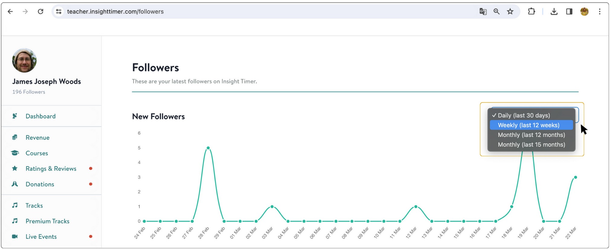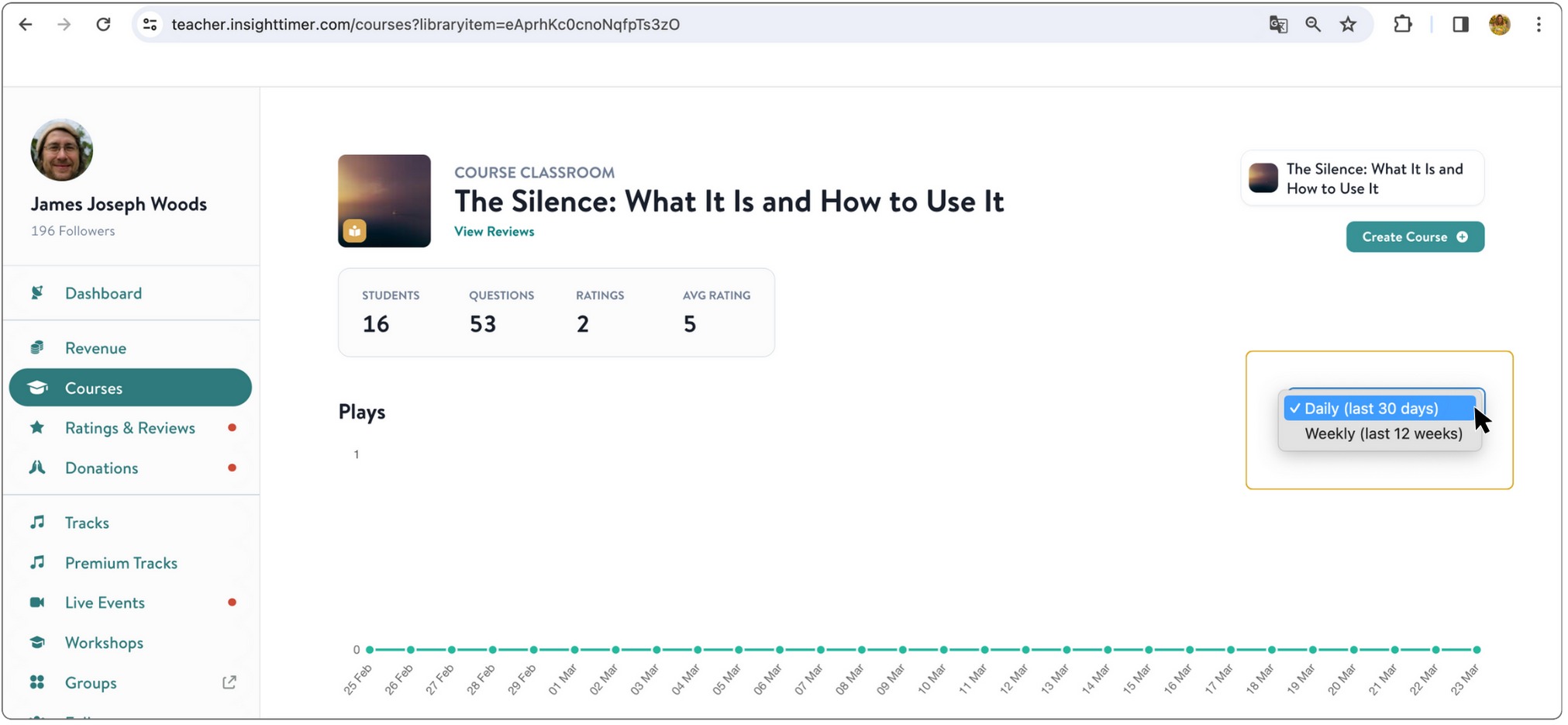 Seeing your content's overall performance is easy and straightforward on Insight Timer. The Teacher Dashboard allows you to see your overall performance and individual performance metrics for tracks and courses over time via a comprehensive dashboard interface. The Dashboard provides detailed data to help you understand what's resonating most with your community members, track your growth trajectory over time, and identify strategic opportunities to improve your meditation, mindfulness, sleep, yoga, breathwork, and other content strategy across our platform.