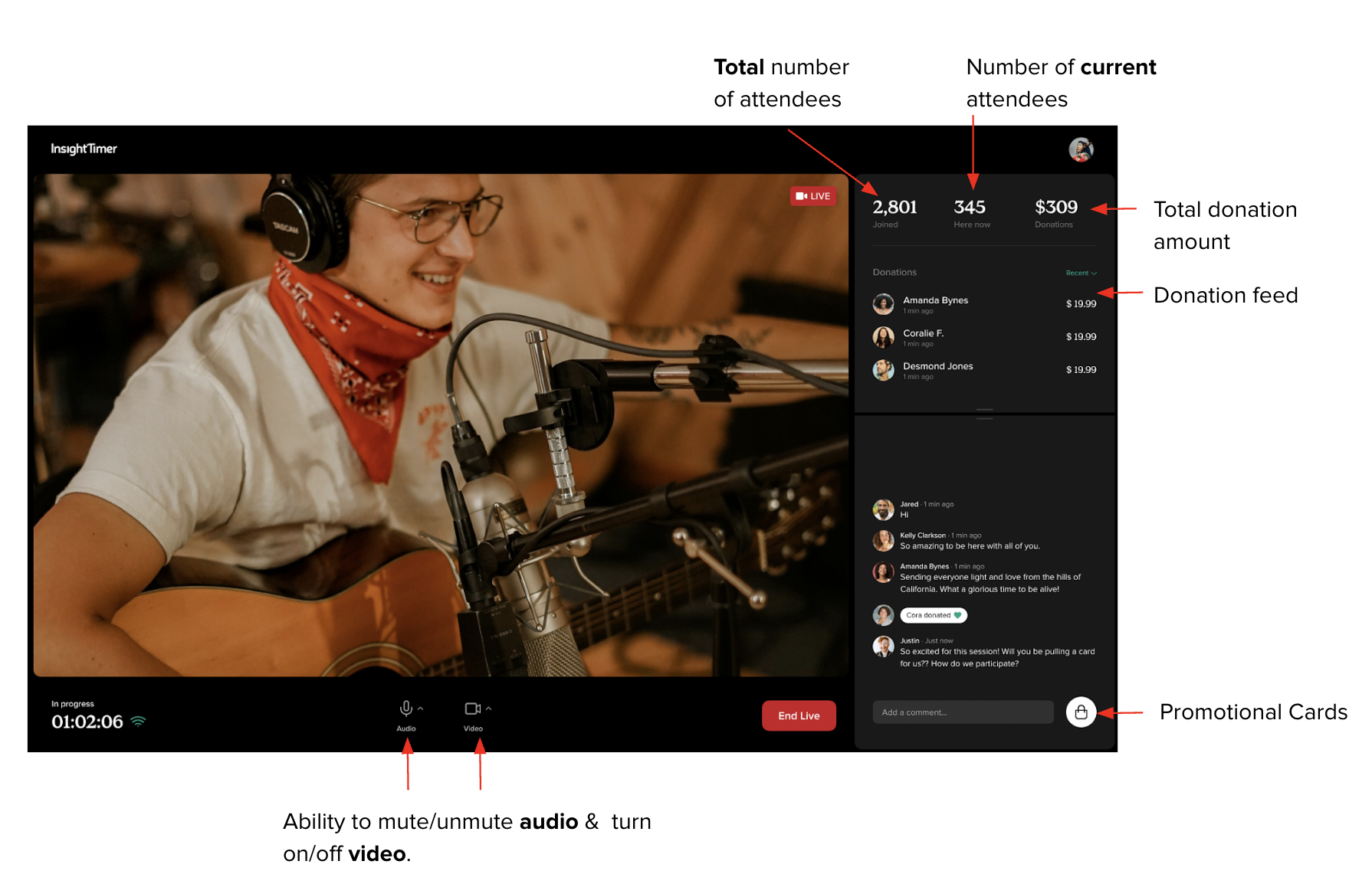 When you host a Live Event on Insight Timer, you’ll have access to a simple and intuitive hosting screen designed to help you manage your session with ease. Below is a guide to understanding the key features available during your event.